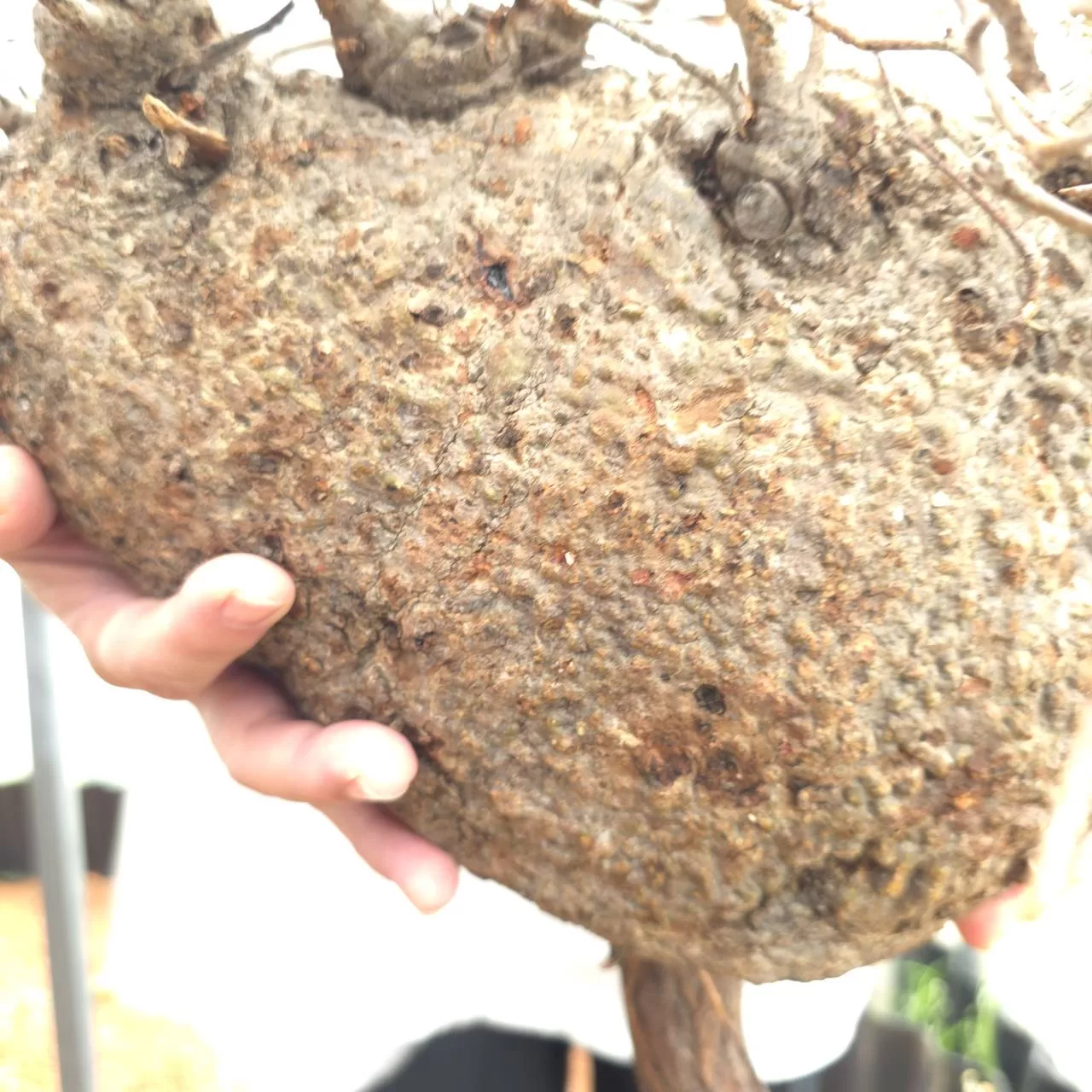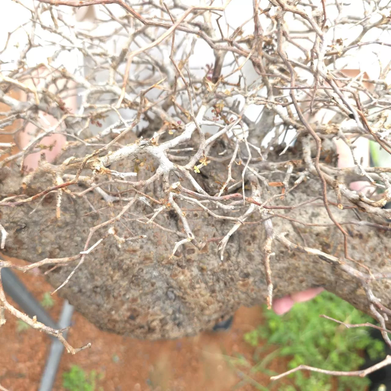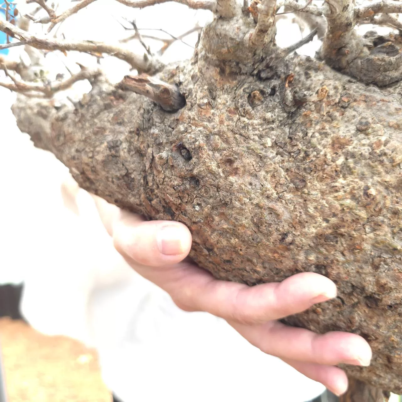 オペルクリカリア・パキプスは、マダガスカル原産の非常に希少な塊根植物で「塊根植物の王様」とも呼ばれています。ウルシ科オペルクリカリア属(Anacardiaceae Operculicarya )に属し、複雑に隆起したコルク状の幹からジグザグに枝を伸ばし、小さな丸い葉を茂らせます。幹の表皮はデコボコしてシルバーの色味を帯びており、独特な風貌と存在感が魅力です。成長は非常に遅く、小さなサイズでも樹齢は50年から150年に達し巨大な株は300年~500年ともいわれていますが、枝は毎年旺盛に伸び、剪定して長く楽しめます。寒さに弱く、冬は室内で育てる必要がありますが、夏は屋外で育てられます。冬には紅葉し、落葉する前に美しい赤い葉を楽しめます。