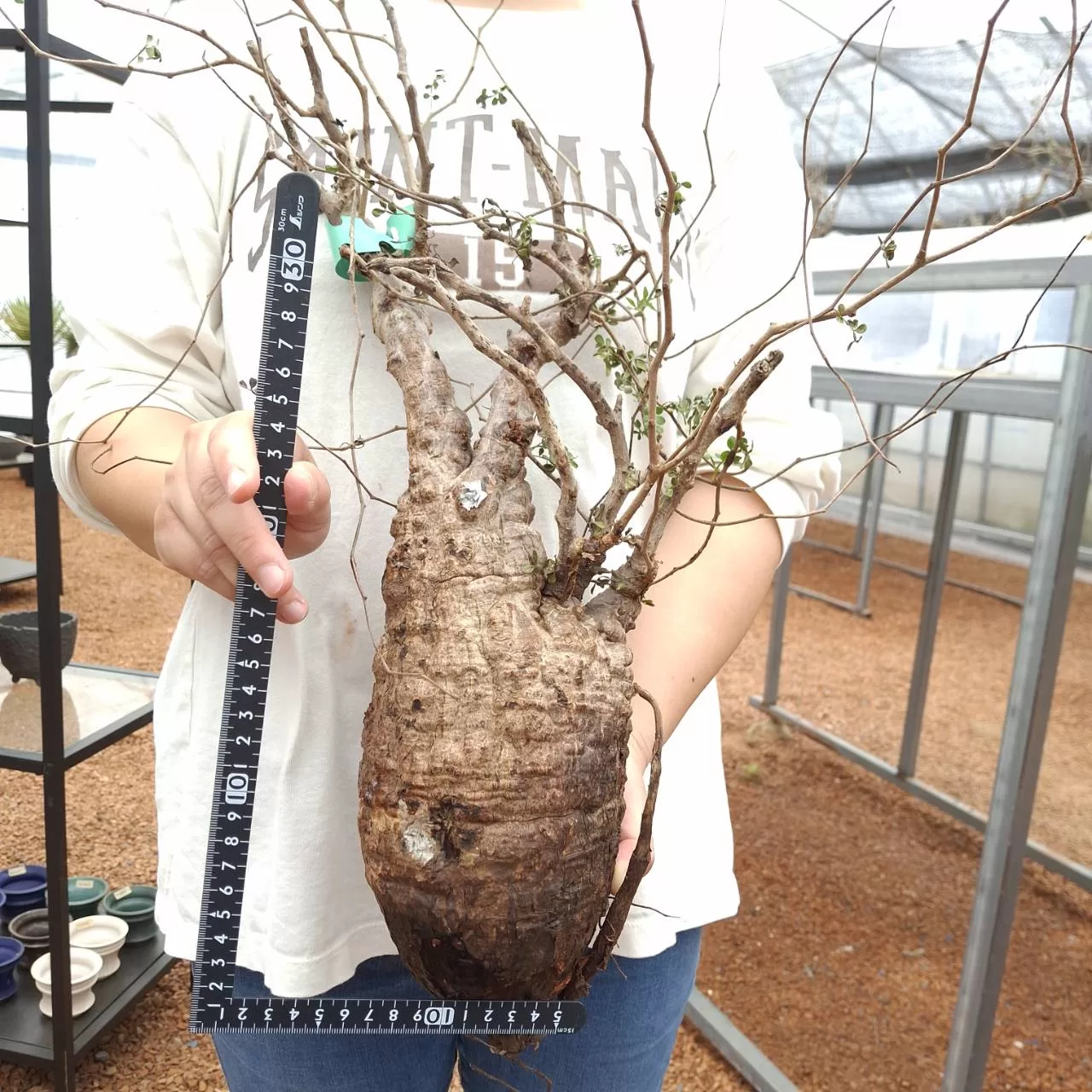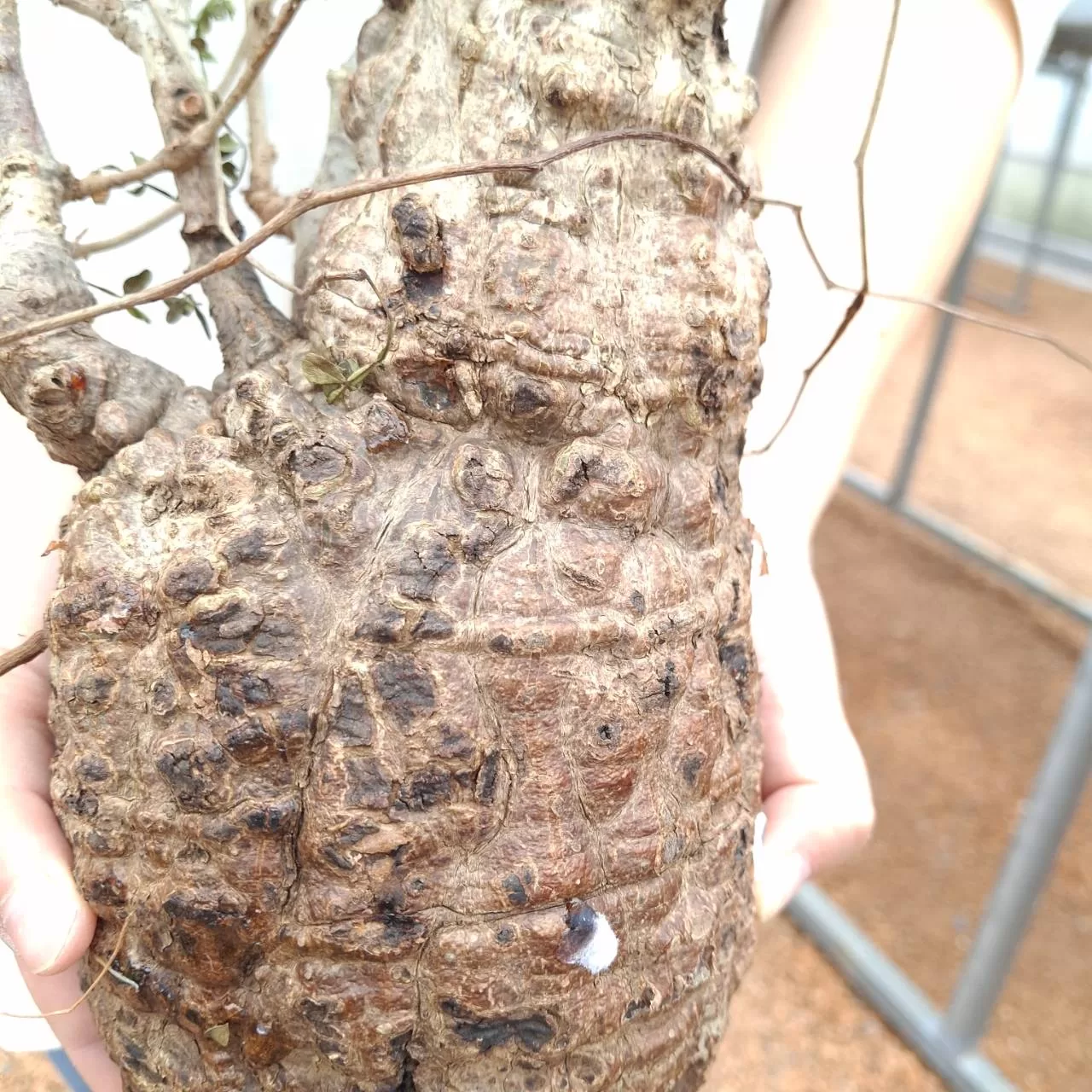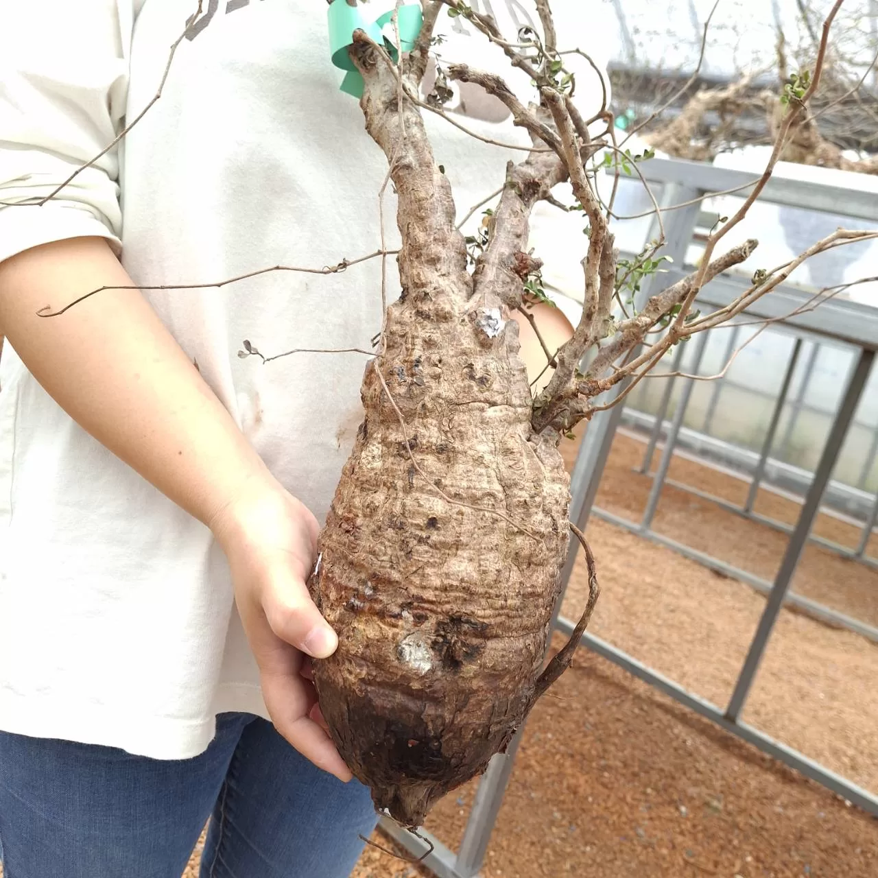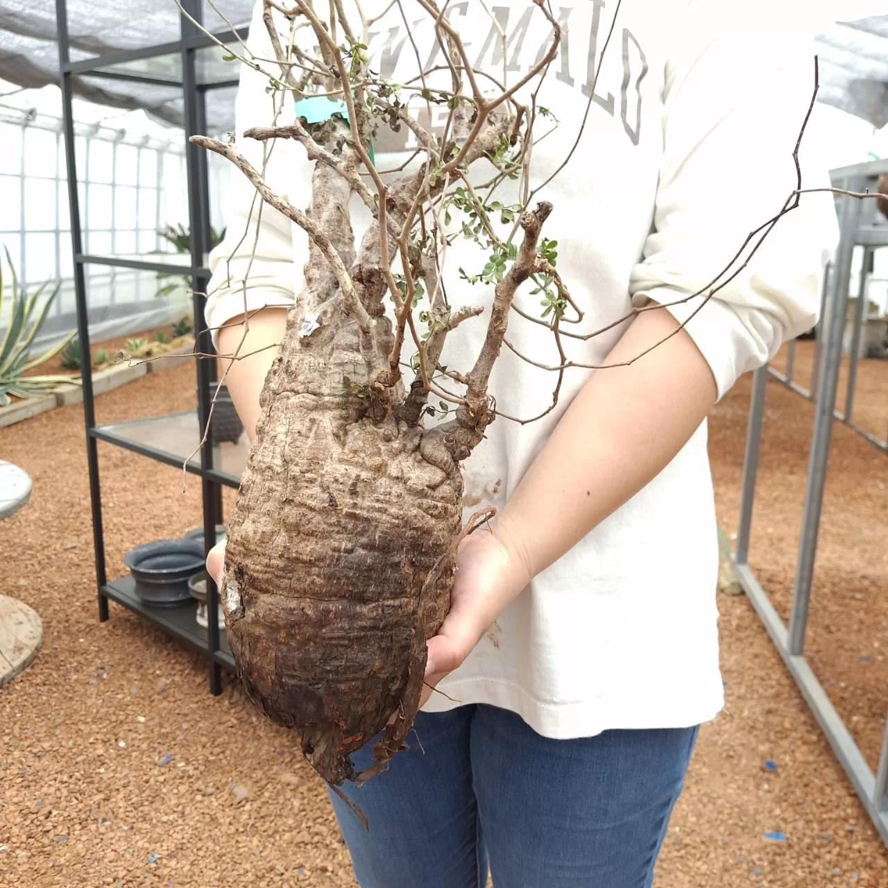 オペルクリカリア・パキプスは、マダガスカル原産の非常に希少な塊根植物で「塊根植物の王様」とも呼ばれています。ウルシ科オペルクリカリア属(Anacardiaceae Operculicarya )に属し、複雑に隆起したコルク状の幹からジグザグに枝を伸ばし、小さな丸い葉を茂らせます。幹の表皮はデコボコしてシルバーの色味を帯びており、独特な風貌と存在感が魅力です。成長は非常に遅く、小さなサイズでも樹齢は50年から150年に達し巨大な株は300年~500年ともいわれていますが、枝は毎年旺盛に伸び、剪定して長く楽しめます。寒さに弱く、冬は室内で育てる必要がありますが、夏は屋外で育てられます。冬には紅葉し、落葉する前に美しい赤い葉を楽しめます。