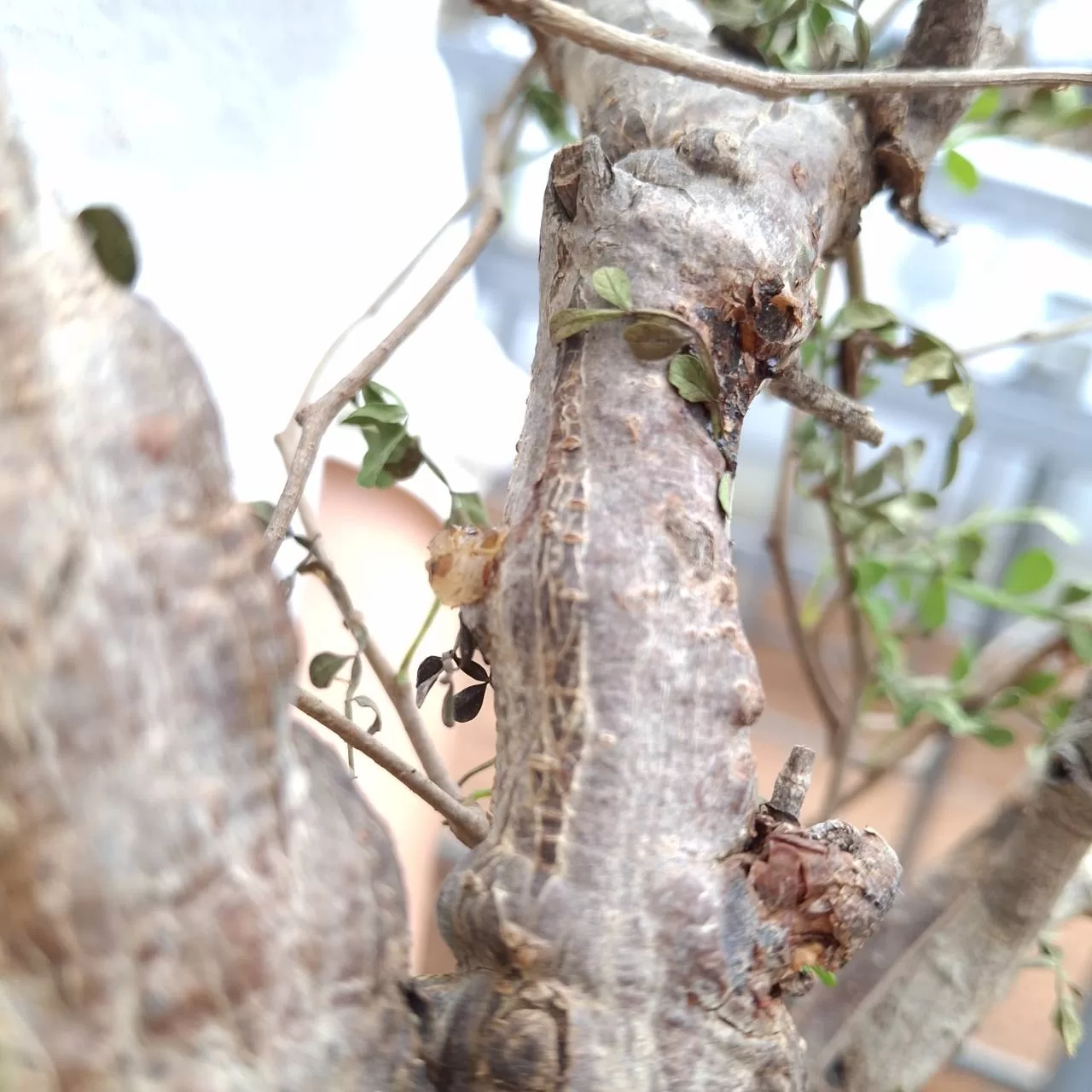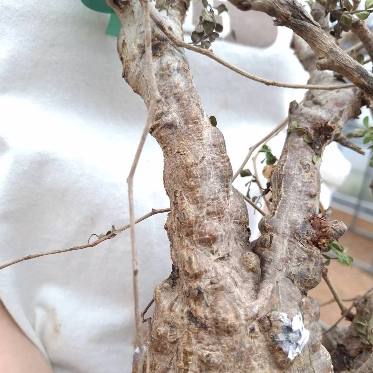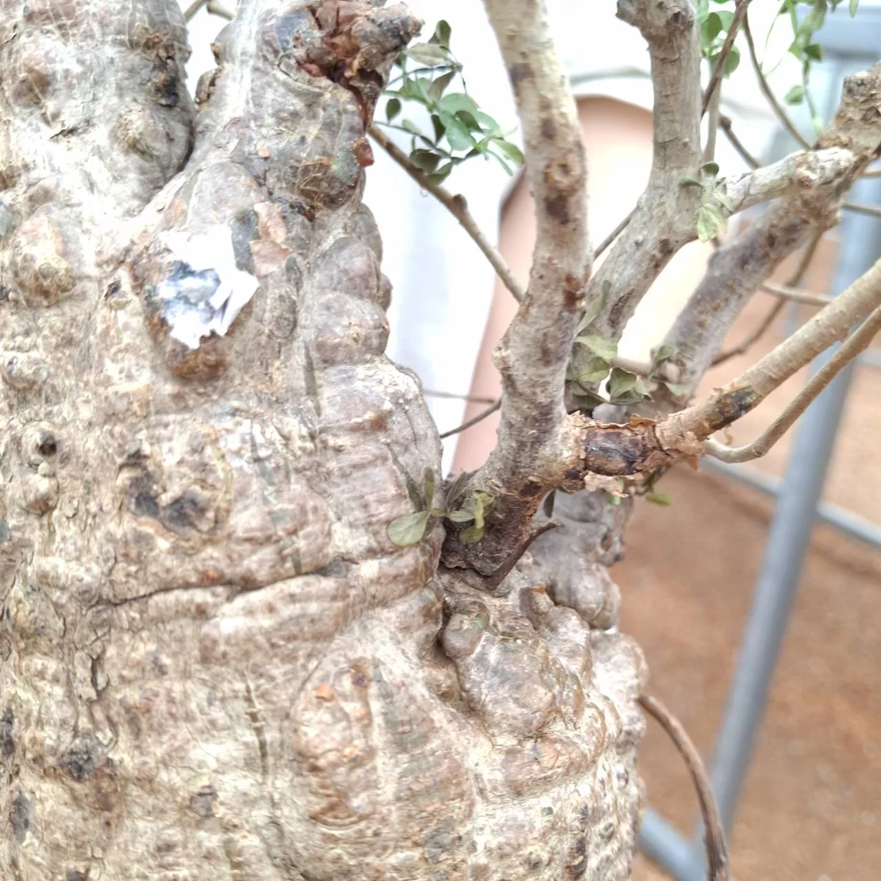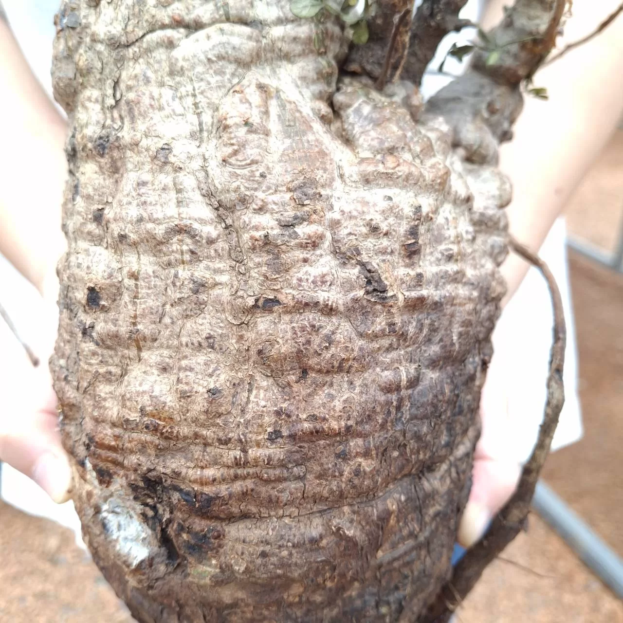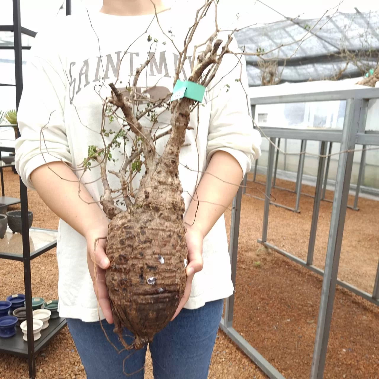 オペルクリカリア・パキプスは、マダガスカル原産の非常に希少な塊根植物で「塊根植物の王様」とも呼ばれています。ウルシ科オペルクリカリア属(Anacardiaceae Operculicarya )に属し、複雑に隆起したコルク状の幹からジグザグに枝を伸ばし、小さな丸い葉を茂らせます。幹の表皮はデコボコしてシルバーの色味を帯びており、独特な風貌と存在感が魅力です。成長は非常に遅く、小さなサイズでも樹齢は50年から150年に達し巨大な株は300年~500年ともいわれていますが、枝は毎年旺盛に伸び、剪定して長く楽しめます。寒さに弱く、冬は室内で育てる必要がありますが、夏は屋外で育てられます。冬には紅葉し、落葉する前に美しい赤い葉を楽しめます。