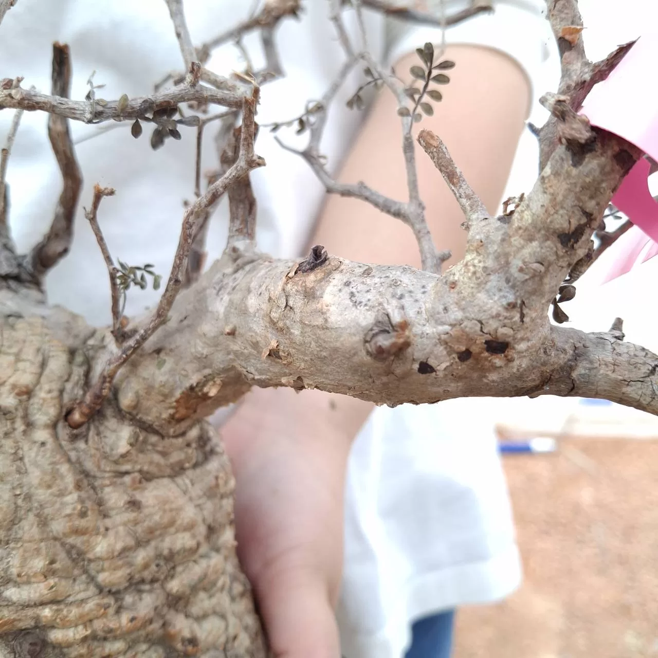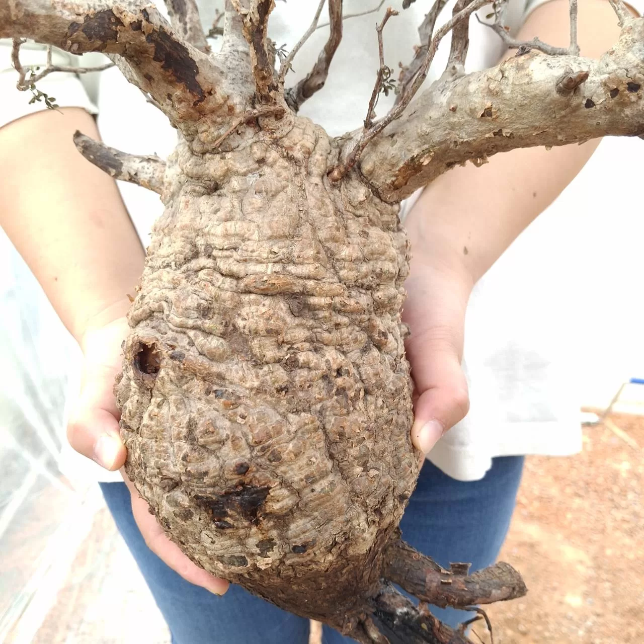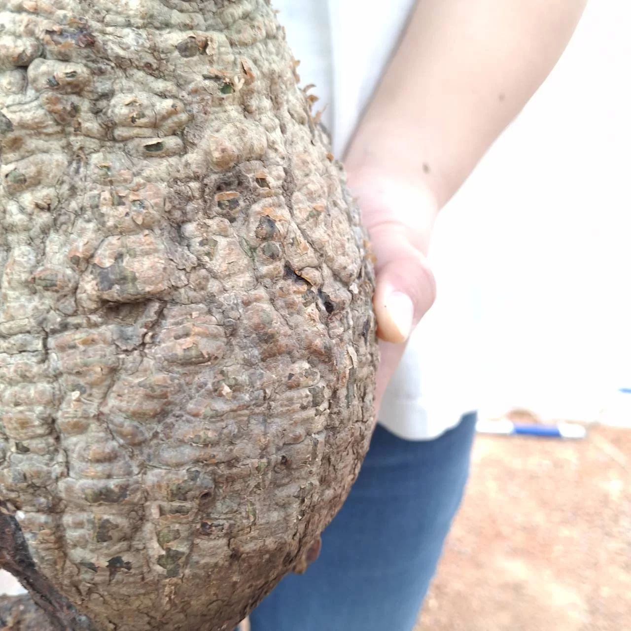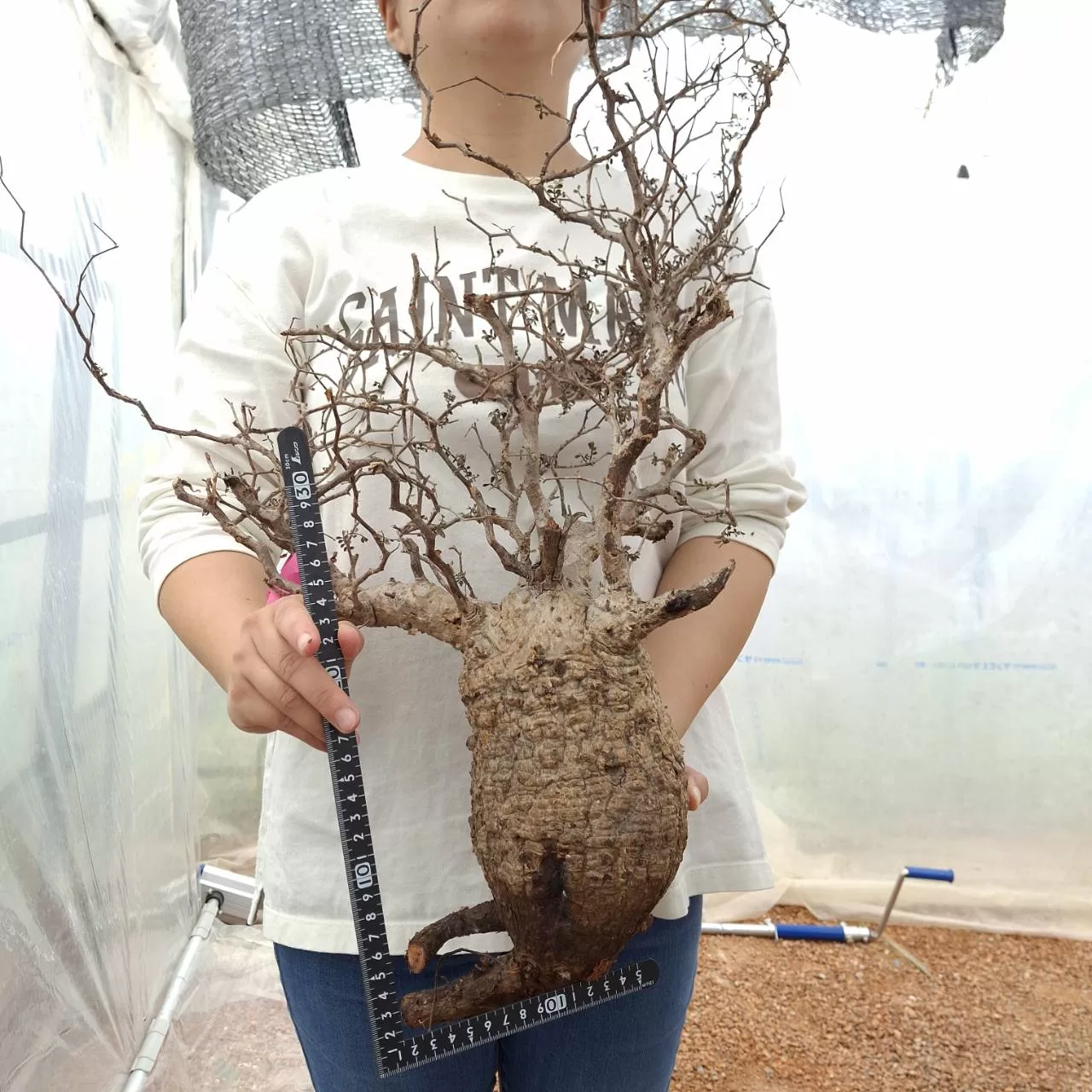 オペルクリカリア・パキプスは、マダガスカル原産の非常に希少な塊根植物で「塊根植物の王様」とも呼ばれています。ウルシ科オペルクリカリア属(Anacardiaceae Operculicarya )に属し、複雑に隆起したコルク状の幹からジグザグに枝を伸ばし、小さな丸い葉を茂らせます。幹の表皮はデコボコしてシルバーの色味を帯びており、独特な風貌と存在感が魅力です。成長は非常に遅く、小さなサイズでも樹齢は50年から150年に達し巨大な株は300年~500年ともいわれていますが、枝は毎年旺盛に伸び、剪定して長く楽しめます。寒さに弱く、冬は室内で育てる必要がありますが、夏は屋外で育てられます。冬には紅葉し、落葉する前に美しい赤い葉を楽しめます。