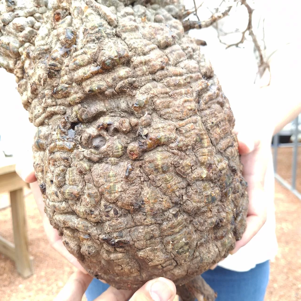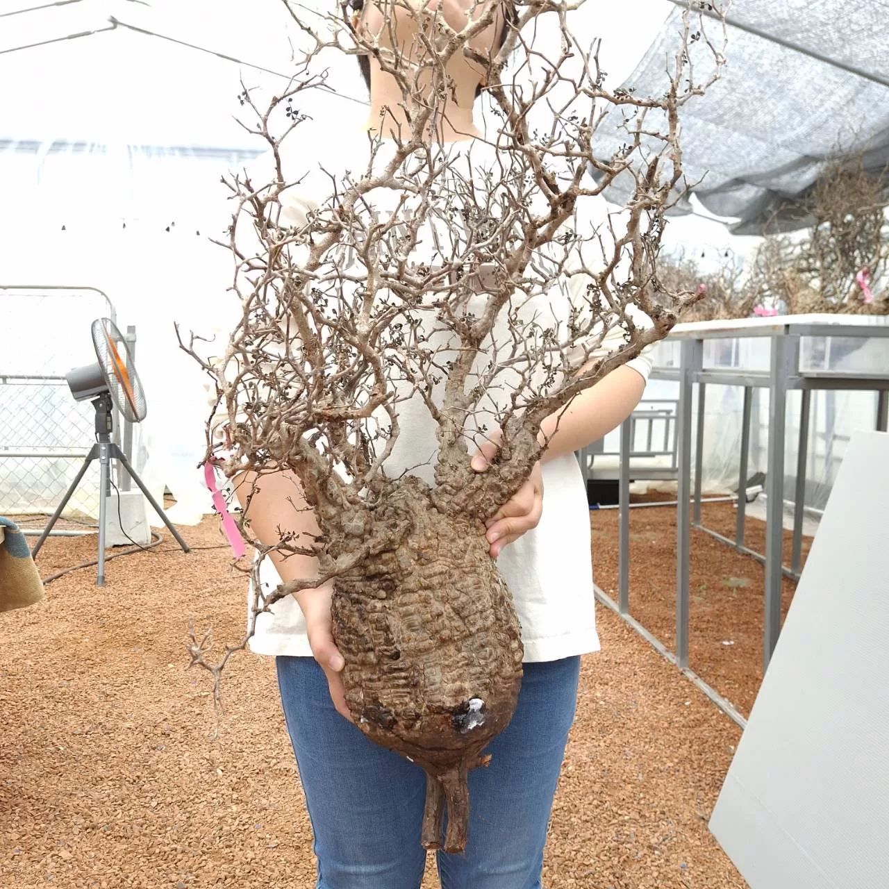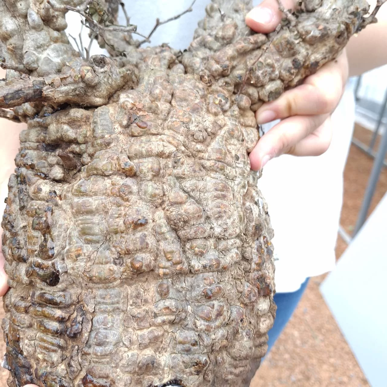 オペルクリカリア・パキプスは、マダガスカル原産の非常に希少な塊根植物で「塊根植物の王様」とも呼ばれています。ウルシ科オペルクリカリア属(Anacardiaceae Operculicarya )に属し、複雑に隆起したコルク状の幹からジグザグに枝を伸ばし、小さな丸い葉を茂らせます。幹の表皮はデコボコしてシルバーの色味を帯びており、独特な風貌と存在感が魅力です。成長は非常に遅く、小さなサイズでも樹齢は50年から150年に達し巨大な株は300年~500年ともいわれていますが、枝は毎年旺盛に伸び、剪定して長く楽しめます。寒さに弱く、冬は室内で育てる必要がありますが、夏は屋外で育てられます。冬には紅葉し、落葉する前に美しい赤い葉を楽しめます。