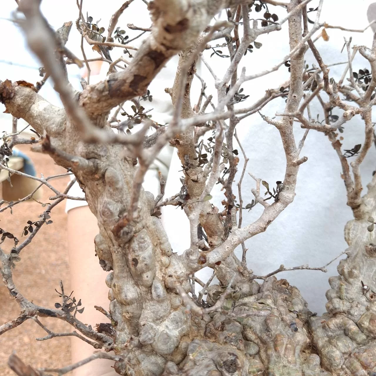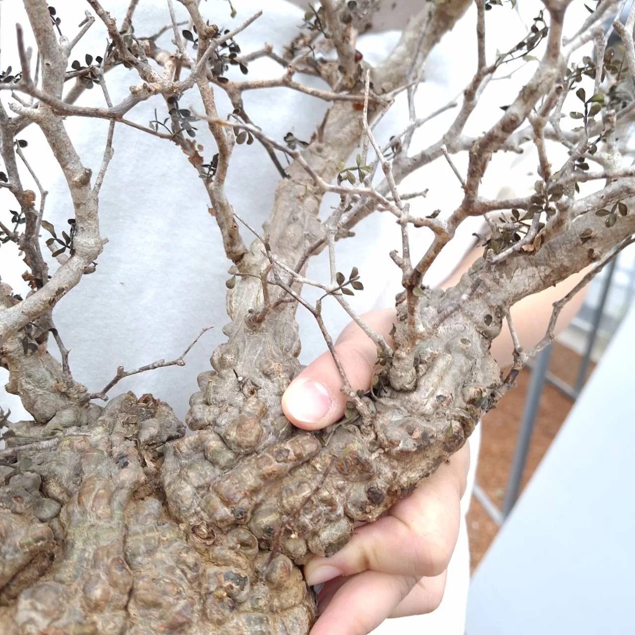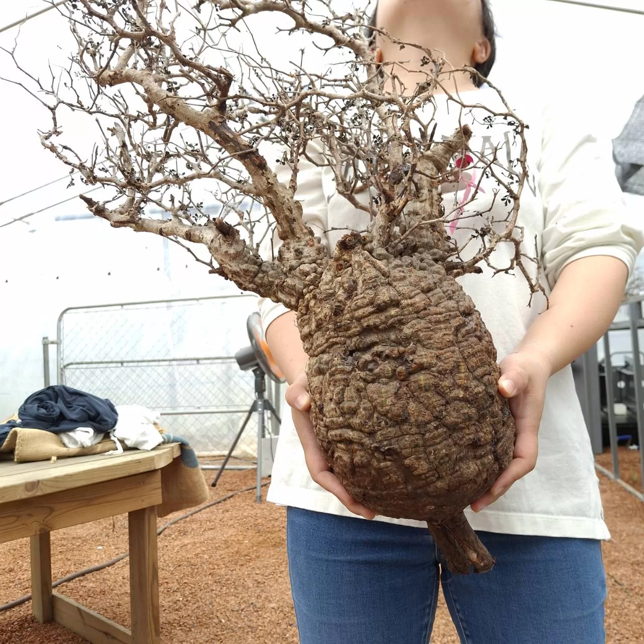 オペルクリカリア・パキプスは、マダガスカル原産の非常に希少な塊根植物で「塊根植物の王様」とも呼ばれています。ウルシ科オペルクリカリア属(Anacardiaceae Operculicarya )に属し、複雑に隆起したコルク状の幹からジグザグに枝を伸ばし、小さな丸い葉を茂らせます。幹の表皮はデコボコしてシルバーの色味を帯びており、独特な風貌と存在感が魅力です。成長は非常に遅く、小さなサイズでも樹齢は50年から150年に達し巨大な株は300年~500年ともいわれていますが、枝は毎年旺盛に伸び、剪定して長く楽しめます。寒さに弱く、冬は室内で育てる必要がありますが、夏は屋外で育てられます。冬には紅葉し、落葉する前に美しい赤い葉を楽しめます。