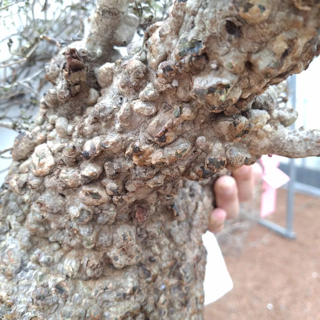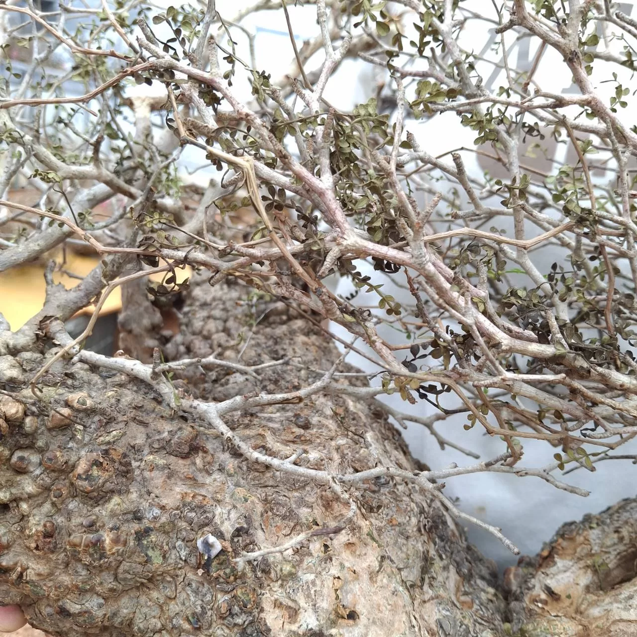オペルクリカリア・パキプスは、マダガスカル原産の非常に希少な塊根植物で「塊根植物の王様」とも呼ばれています。ウルシ科オペルクリカリア属(Anacardiaceae Operculicarya )に属し、複雑に隆起したコルク状の幹からジグザグに枝を伸ばし、小さな丸い葉を茂らせます。幹の表皮はデコボコしてシルバーの色味を帯びており、独特な風貌と存在感が魅力です。成長は非常に遅く、小さなサイズでも樹齢は50年から150年に達し巨大な株は300年~500年ともいわれていますが、枝は毎年旺盛に伸び、剪定して長く楽しめます。寒さに弱く、冬は室内で育てる必要がありますが、夏は屋外で育てられます。冬には紅葉し、落葉する前に美しい赤い葉を楽しめます。