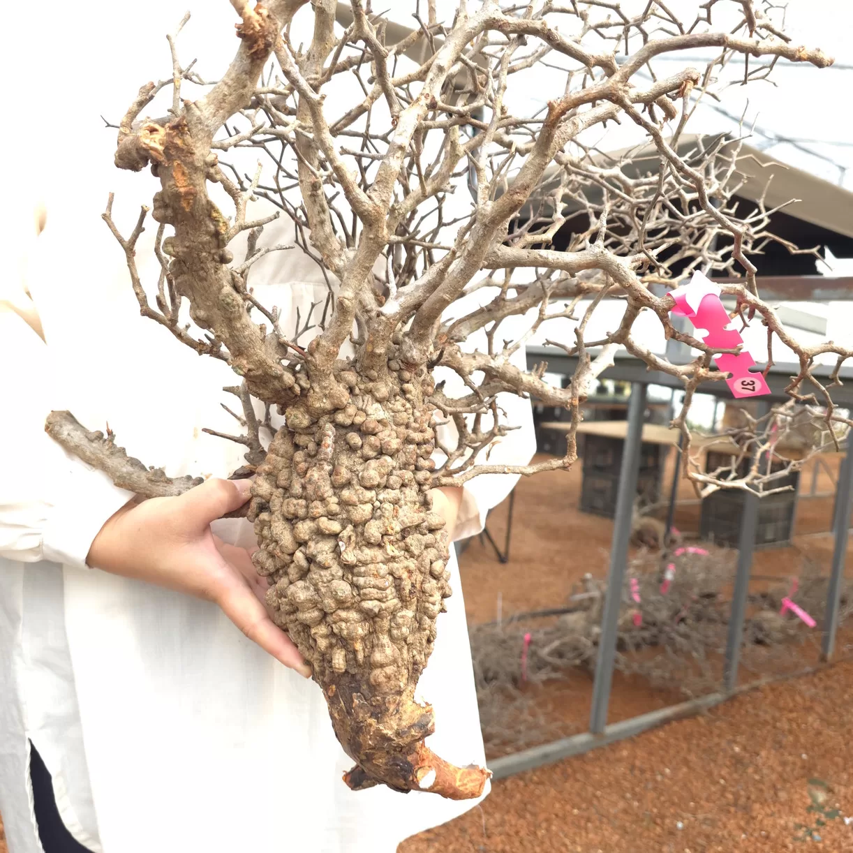 オペルクリカリア・パキプスは、マダガスカル原産の非常に希少な塊根植物で「塊根植物の王様」とも呼ばれています。ウルシ科オペルクリカリア属(Anacardiaceae Operculicarya )に属し、複雑に隆起したコルク状の幹からジグザグに枝を伸ばし、小さな丸い葉を茂らせます。幹の表皮はデコボコしてシルバーの色味を帯びており、独特な風貌と存在感が魅力です。成長は非常に遅く、小さなサイズでも樹齢は50年から150年に達し巨大な株は300年~500年ともいわれていますが、枝は毎年旺盛に伸び、剪定して長く楽しめます。寒さに弱く、冬は室内で育てる必要がありますが、夏は屋外で育てられます。冬には紅葉し、落葉する前に美しい赤い葉を楽しめます。