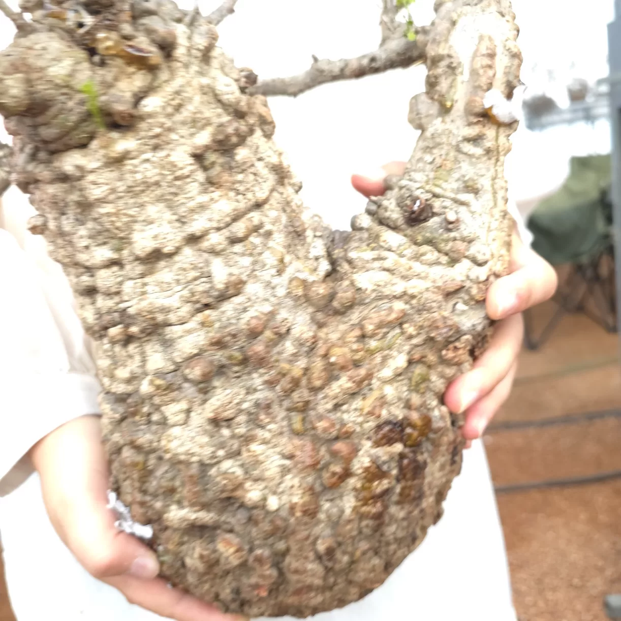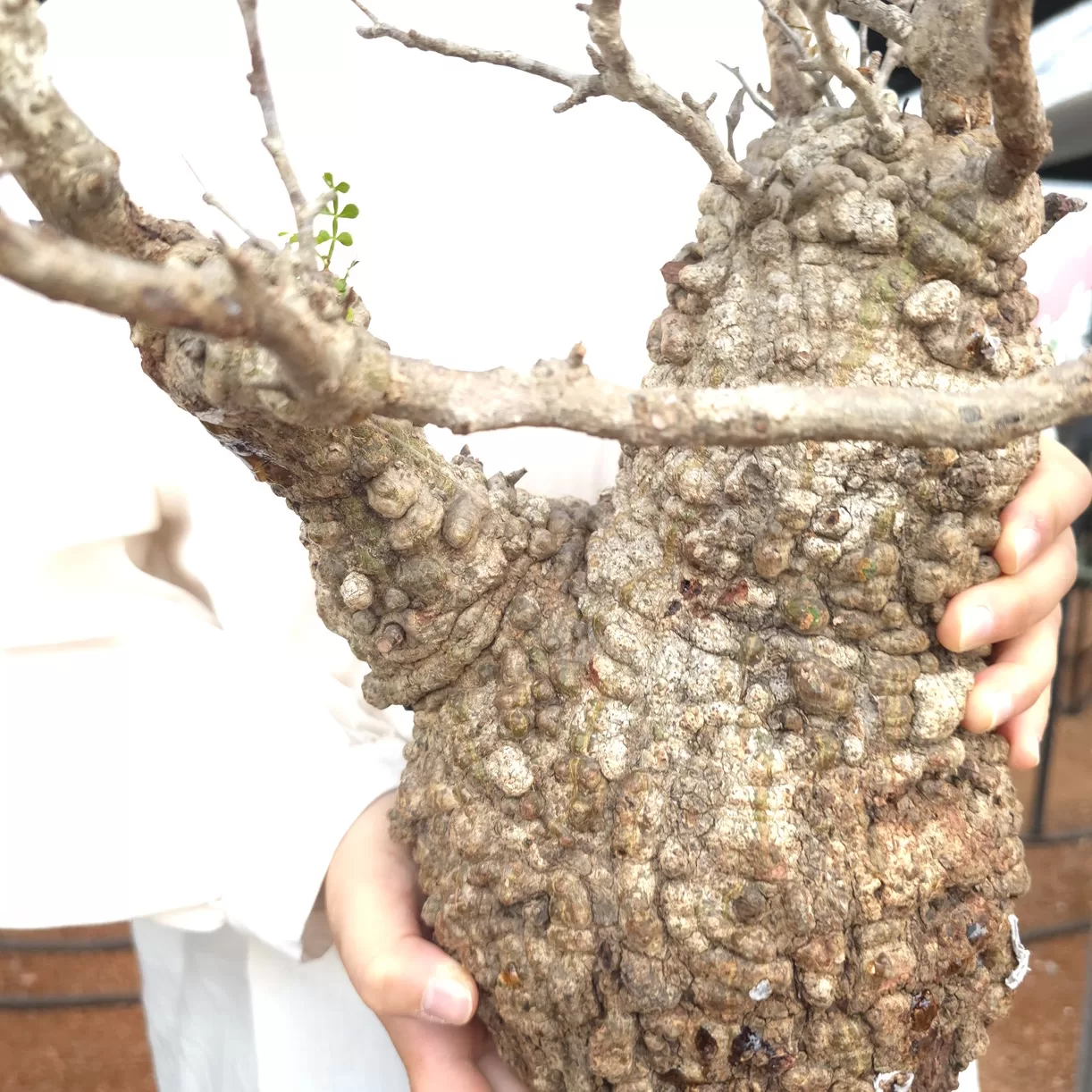 オペルクリカリア・パキプスは、マダガスカル原産の非常に希少な塊根植物で「塊根植物の王様」とも呼ばれています。ウルシ科オペルクリカリア属(Anacardiaceae Operculicarya )に属し、複雑に隆起したコルク状の幹からジグザグに枝を伸ばし、小さな丸い葉を茂らせます。幹の表皮はデコボコしてシルバーの色味を帯びており、独特な風貌と存在感が魅力です。成長は非常に遅く、小さなサイズでも樹齢は50年から150年に達し巨大な株は300年~500年ともいわれていますが、枝は毎年旺盛に伸び、剪定して長く楽しめます。寒さに弱く、冬は室内で育てる必要がありますが、夏は屋外で育てられます。冬には紅葉し、落葉する前に美しい赤い葉を楽しめます。