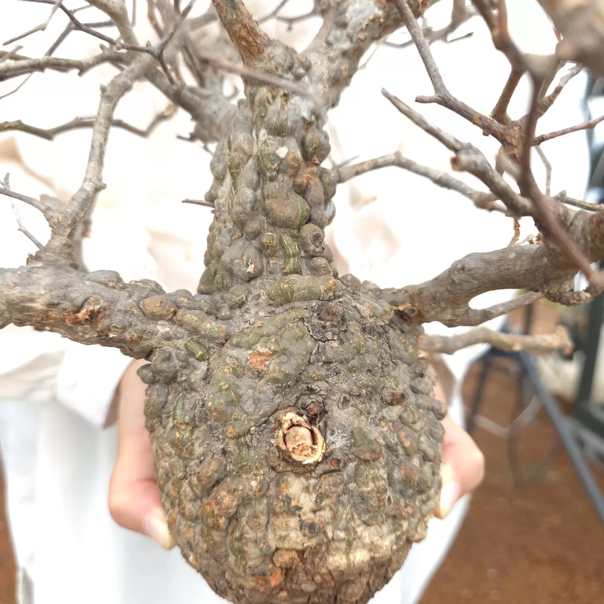 オペルクリカリア・パキプスは、マダガスカル原産の非常に希少な塊根植物で「塊根植物の王様」とも呼ばれています。ウルシ科オペルクリカリア属(Anacardiaceae Operculicarya )に属し、複雑に隆起したコルク状の幹からジグザグに枝を伸ばし、小さな丸い葉を茂らせます。幹の表皮はデコボコしてシルバーの色味を帯びており、独特な風貌と存在感が魅力です。成長は非常に遅く、小さなサイズでも樹齢は50年から150年に達し巨大な株は300年~500年ともいわれていますが、枝は毎年旺盛に伸び、剪定して長く楽しめます。寒さに弱く、冬は室内で育てる必要がありますが、夏は屋外で育てられます。冬には紅葉し、落葉する前に美しい赤い葉を楽しめます。