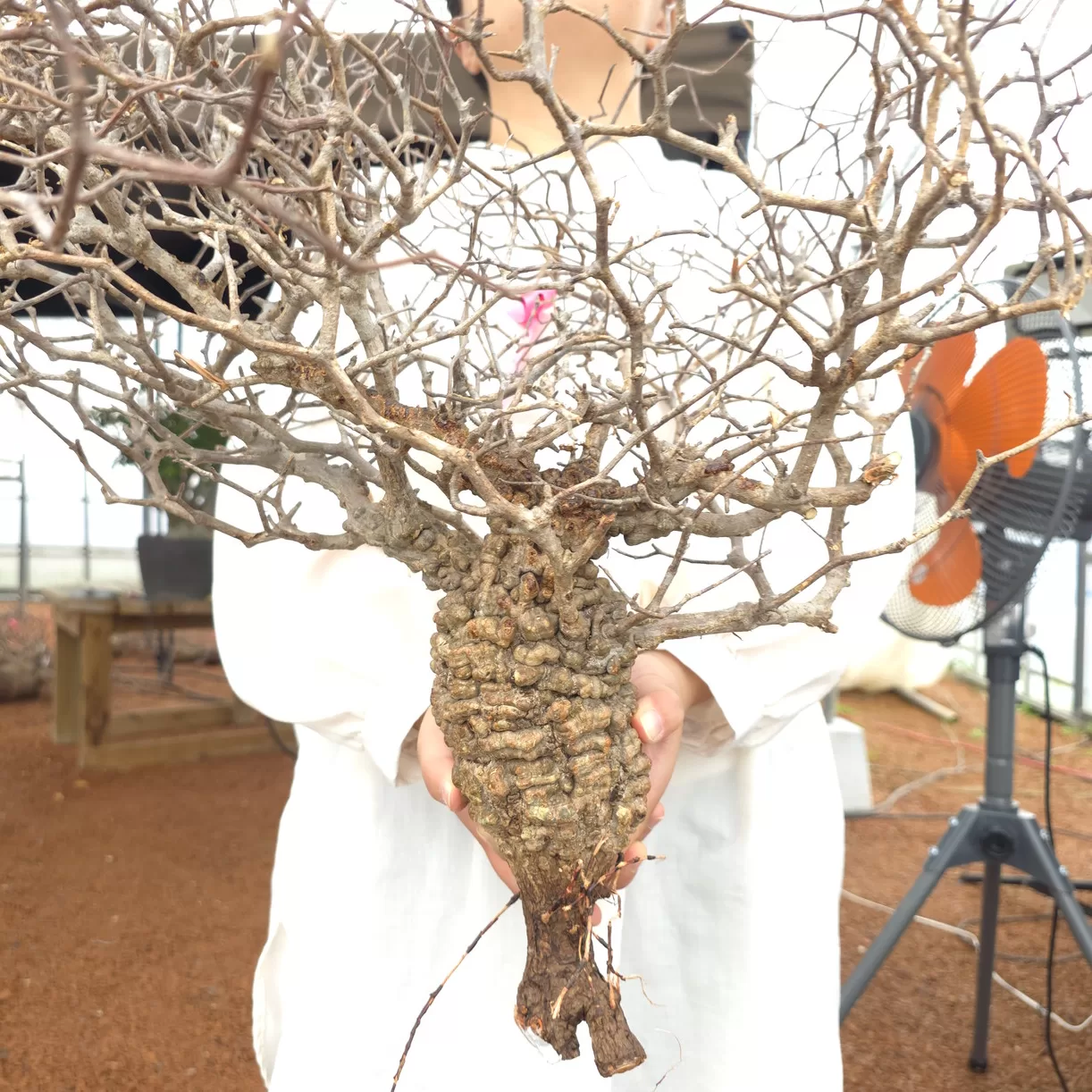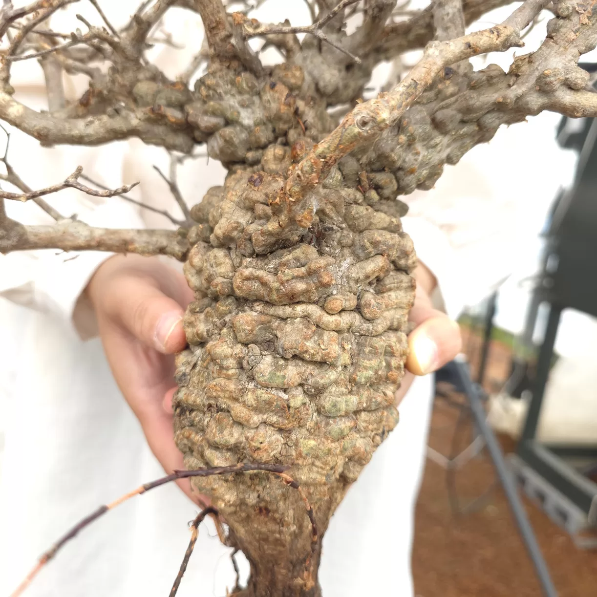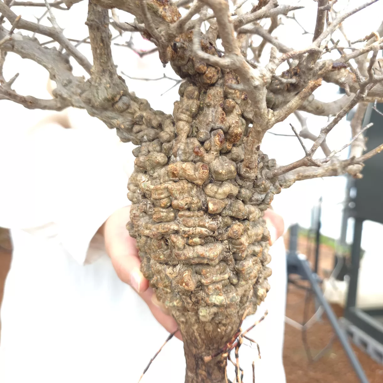 オペルクリカリア・パキプスは、マダガスカル原産の非常に希少な塊根植物で「塊根植物の王様」とも呼ばれています。ウルシ科オペルクリカリア属(Anacardiaceae Operculicarya )に属し、複雑に隆起したコルク状の幹からジグザグに枝を伸ばし、小さな丸い葉を茂らせます。幹の表皮はデコボコしてシルバーの色味を帯びており、独特な風貌と存在感が魅力です。成長は非常に遅く、小さなサイズでも樹齢は50年から150年に達し巨大な株は300年~500年ともいわれていますが、枝は毎年旺盛に伸び、剪定して長く楽しめます。寒さに弱く、冬は室内で育てる必要がありますが、夏は屋外で育てられます。冬には紅葉し、落葉する前に美しい赤い葉を楽しめます。