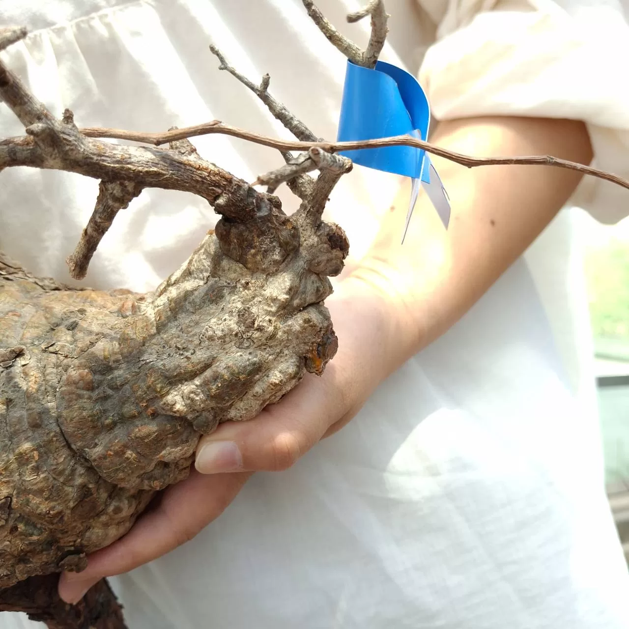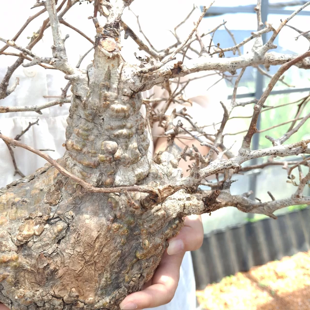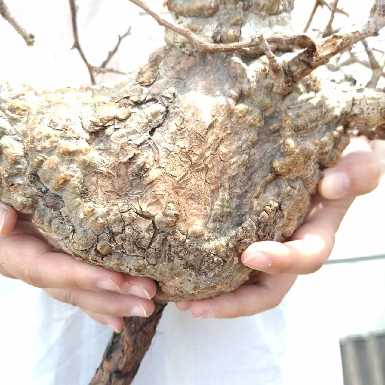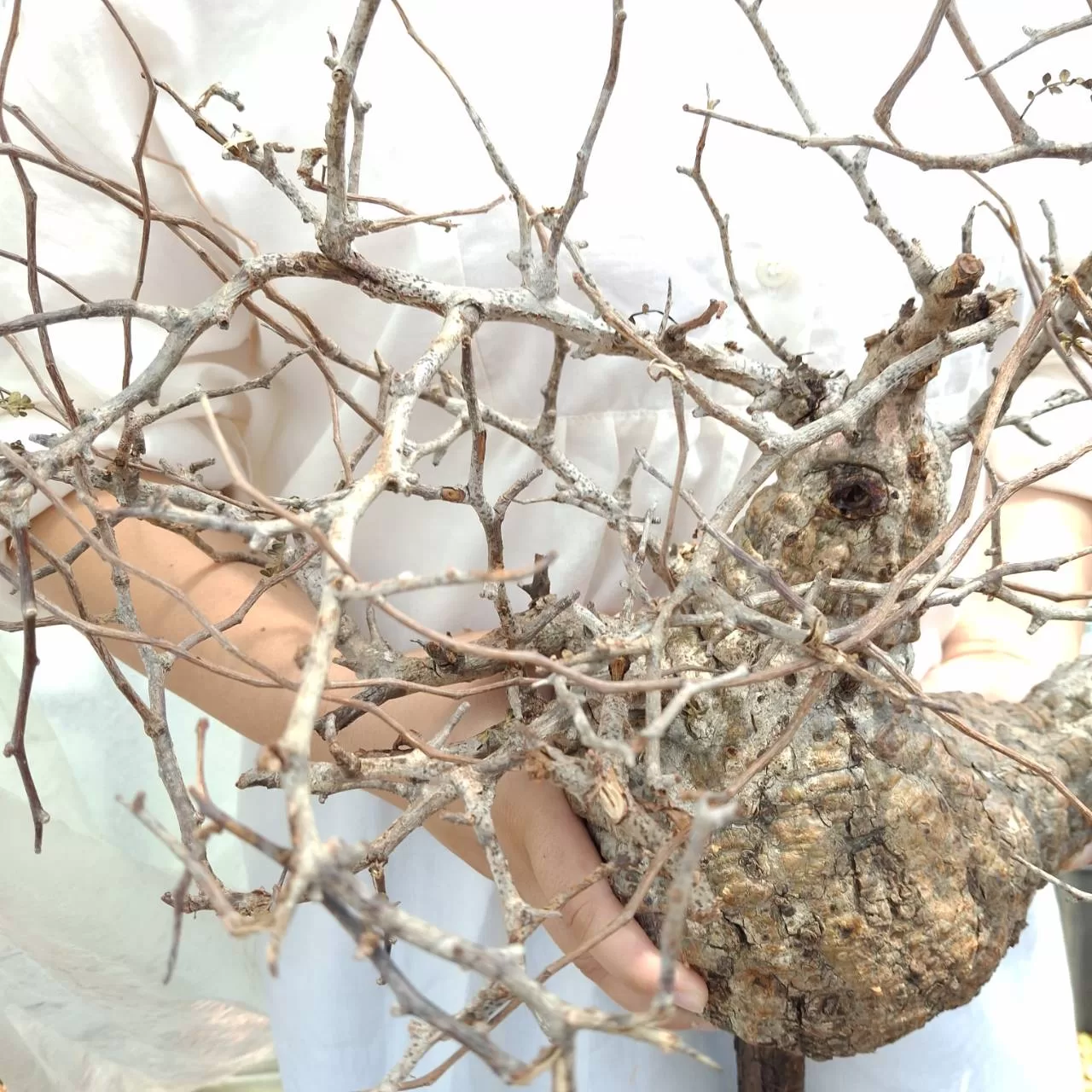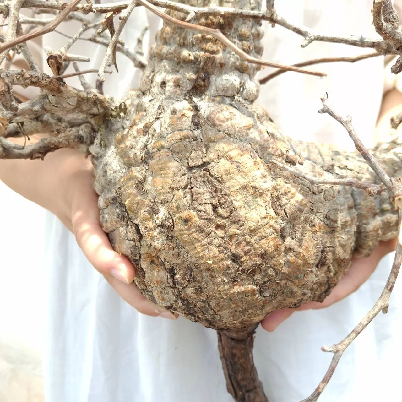 オペルクリカリア・パキプスは、マダガスカル原産の非常に希少な塊根植物で「塊根植物の王様」とも呼ばれています。ウルシ科オペルクリカリア属(Anacardiaceae Operculicarya )に属し、複雑に隆起したコルク状の幹からジグザグに枝を伸ばし、小さな丸い葉を茂らせます。幹の表皮はデコボコしてシルバーの色味を帯びており、独特な風貌と存在感が魅力です。成長は非常に遅く、小さなサイズでも樹齢は50年から150年に達し巨大な株は300年~500年ともいわれていますが、枝は毎年旺盛に伸び、剪定して長く楽しめます。寒さに弱く、冬は室内で育てる必要がありますが、夏は屋外で育てられます。冬には紅葉し、落葉する前に美しい赤い葉を楽しめます。