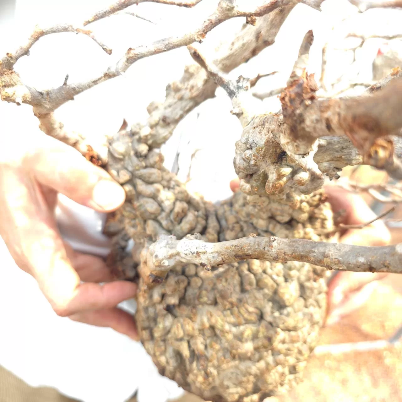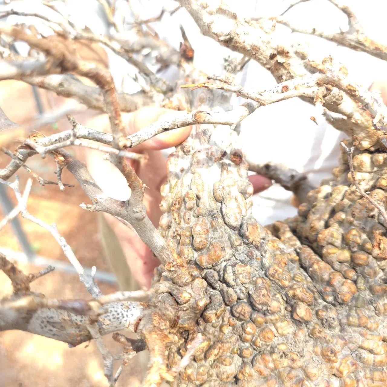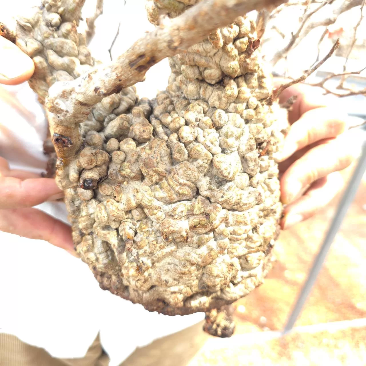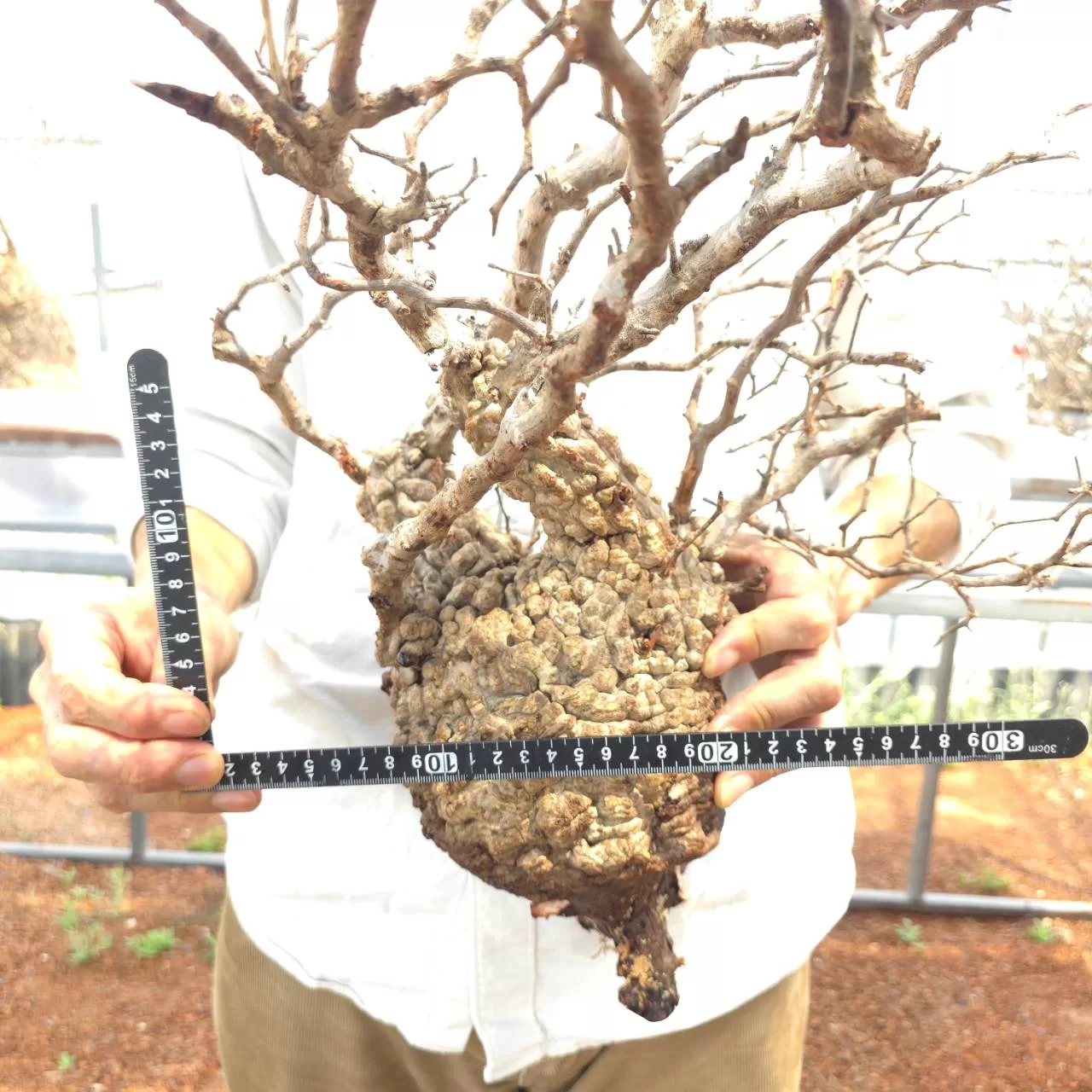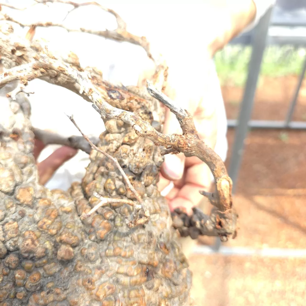 オペルクリカリア・パキプスは、マダガスカル原産の非常に希少な塊根植物で「塊根植物の王様」とも呼ばれています。ウルシ科オペルクリカリア属(Anacardiaceae Operculicarya )に属し、複雑に隆起したコルク状の幹からジグザグに枝を伸ばし、小さな丸い葉を茂らせます。幹の表皮はデコボコしてシルバーの色味を帯びており、独特な風貌と存在感が魅力です。成長は非常に遅く、小さなサイズでも樹齢は50年から150年に達し巨大な株は300年~500年ともいわれていますが、枝は毎年旺盛に伸び、剪定して長く楽しめます。寒さに弱く、冬は室内で育てる必要がありますが、夏は屋外で育てられます。冬には紅葉し、落葉する前に美しい赤い葉を楽しめます。