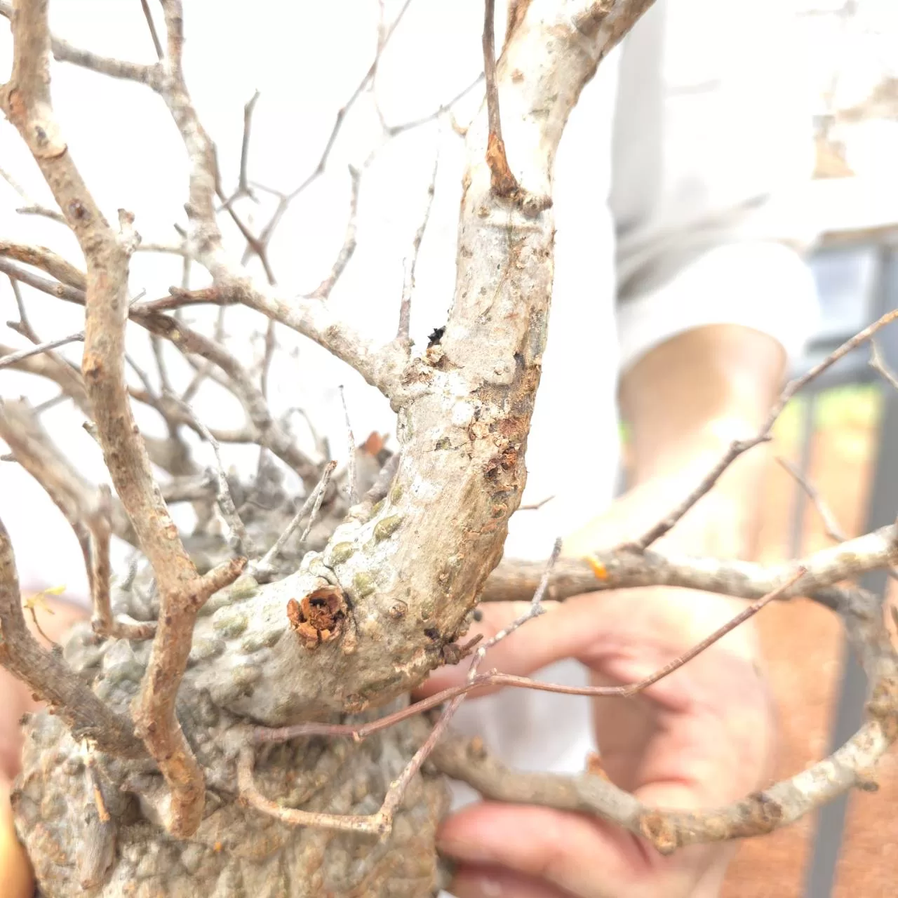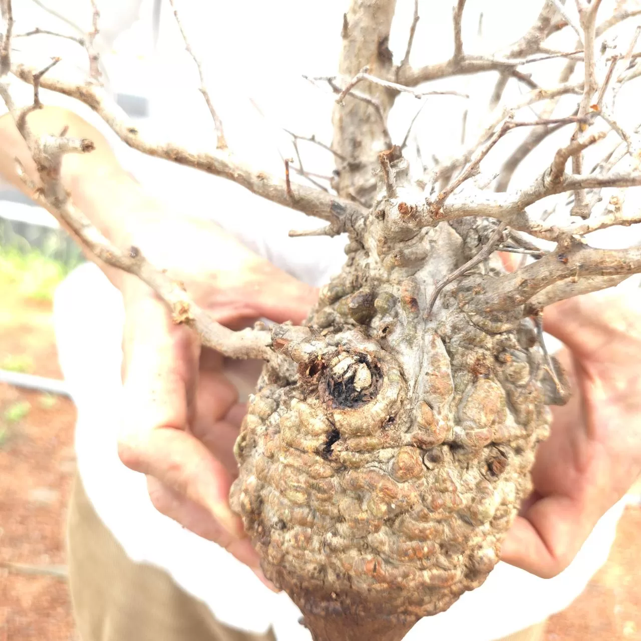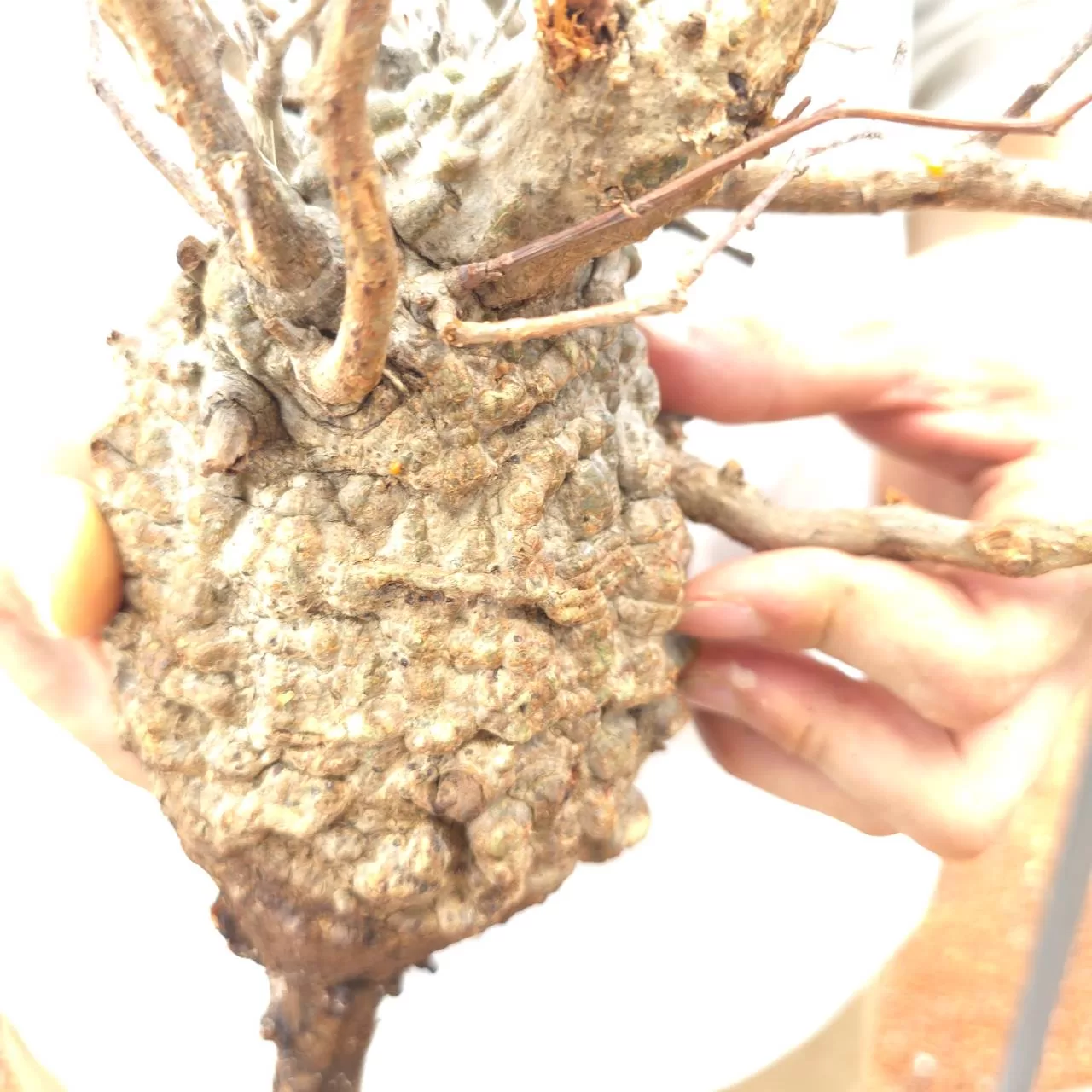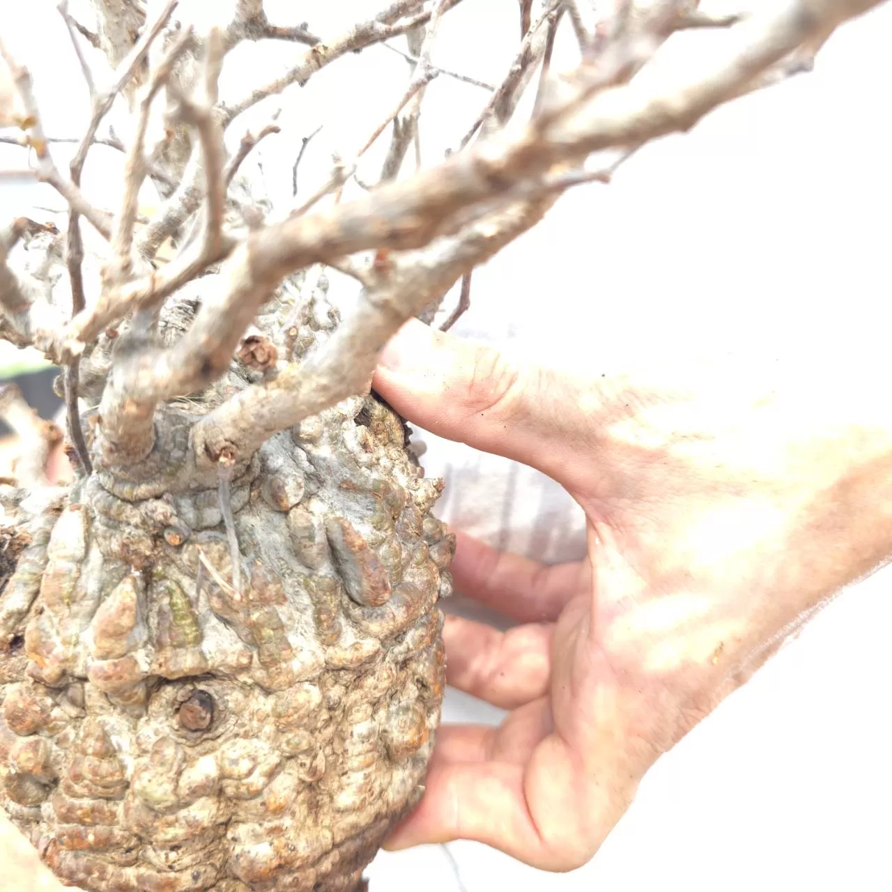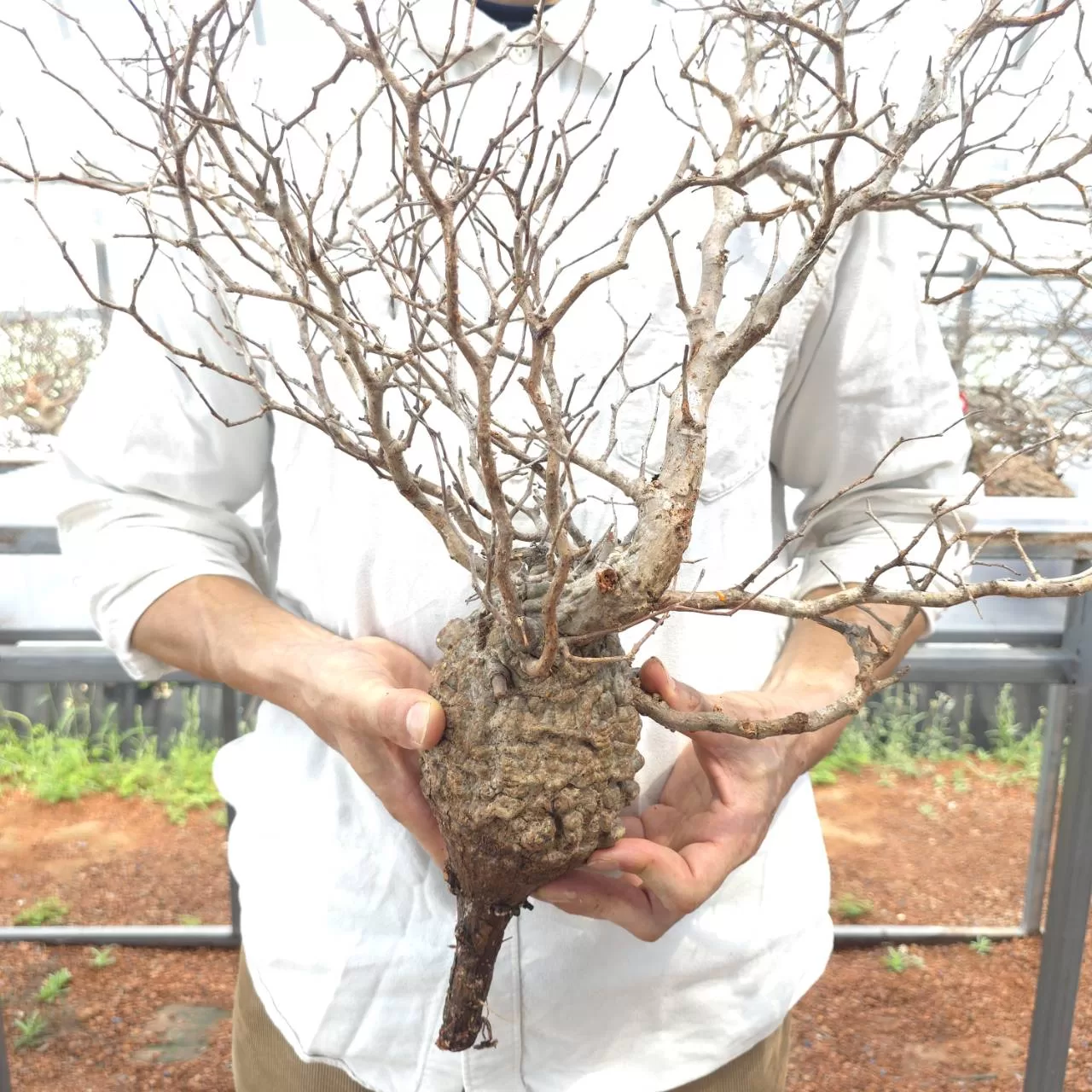 オペルクリカリア・パキプスは、マダガスカル原産の非常に希少な塊根植物で「塊根植物の王様」とも呼ばれています。ウルシ科オペルクリカリア属(Anacardiaceae Operculicarya )に属し、複雑に隆起したコルク状の幹からジグザグに枝を伸ばし、小さな丸い葉を茂らせます。幹の表皮はデコボコしてシルバーの色味を帯びており、独特な風貌と存在感が魅力です。成長は非常に遅く、小さなサイズでも樹齢は50年から150年に達し巨大な株は300年~500年ともいわれていますが、枝は毎年旺盛に伸び、剪定して長く楽しめます。寒さに弱く、冬は室内で育てる必要がありますが、夏は屋外で育てられます。冬には紅葉し、落葉する前に美しい赤い葉を楽しめます。