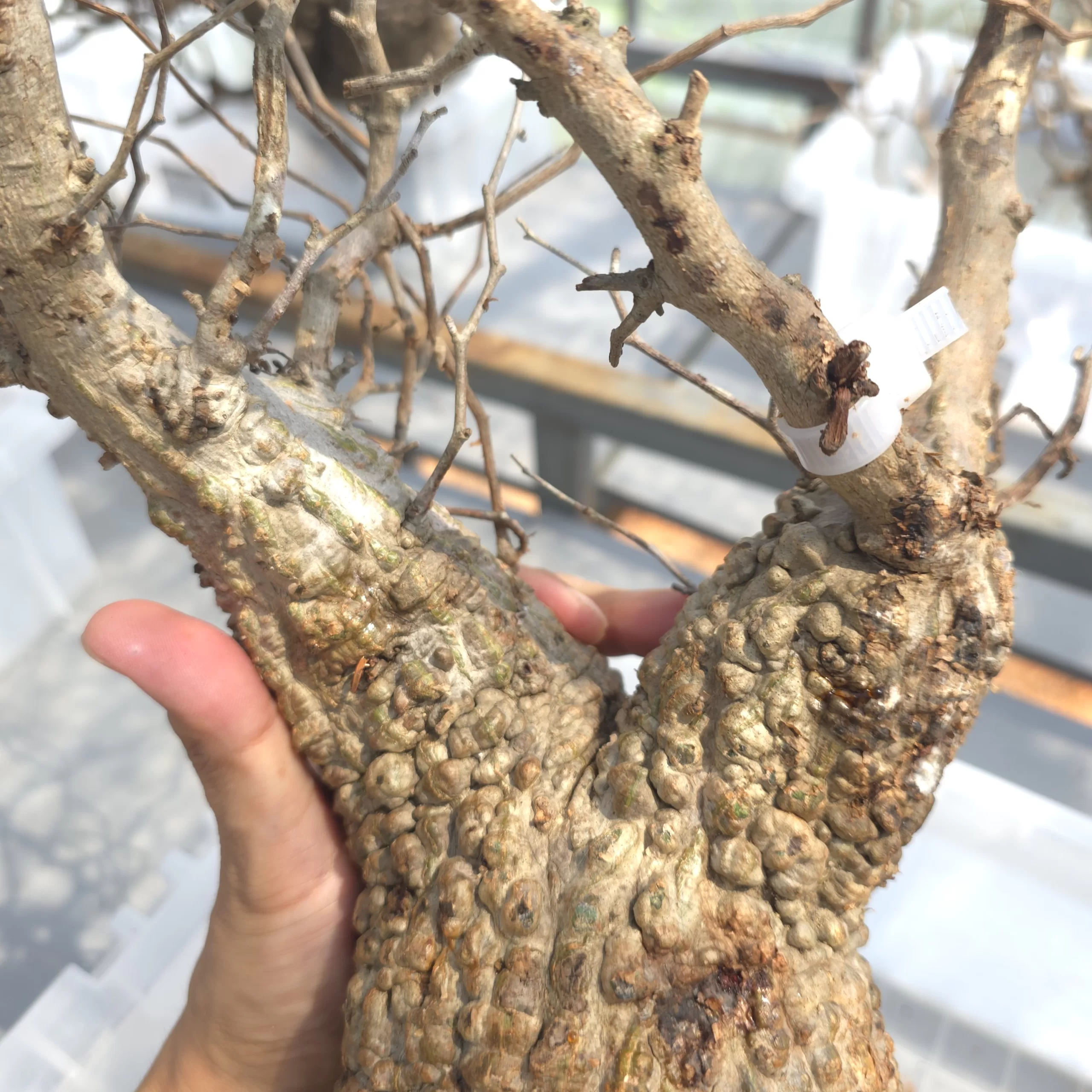 オペルクリカリア・パキプスは、マダガスカル原産の非常に希少な塊根植物で「塊根植物の王様」とも呼ばれています。ウルシ科オペルクリカリア属(Anacardiaceae Operculicarya )に属し、複雑に隆起したコルク状の幹からジグザグに枝を伸ばし、小さな丸い葉を茂らせます。幹の表皮はデコボコしてシルバーの色味を帯びており、独特な風貌と存在感が魅力です。成長は非常に遅く、小さなサイズでも樹齢は50年から150年に達し巨大な株は300年~500年ともいわれていますが、枝は毎年旺盛に伸び、剪定して長く楽しめます。寒さに弱く、冬は室内で育てる必要がありますが、夏は屋外で育てられます。冬には紅葉し、落葉する前に美しい赤い葉を楽しめます。