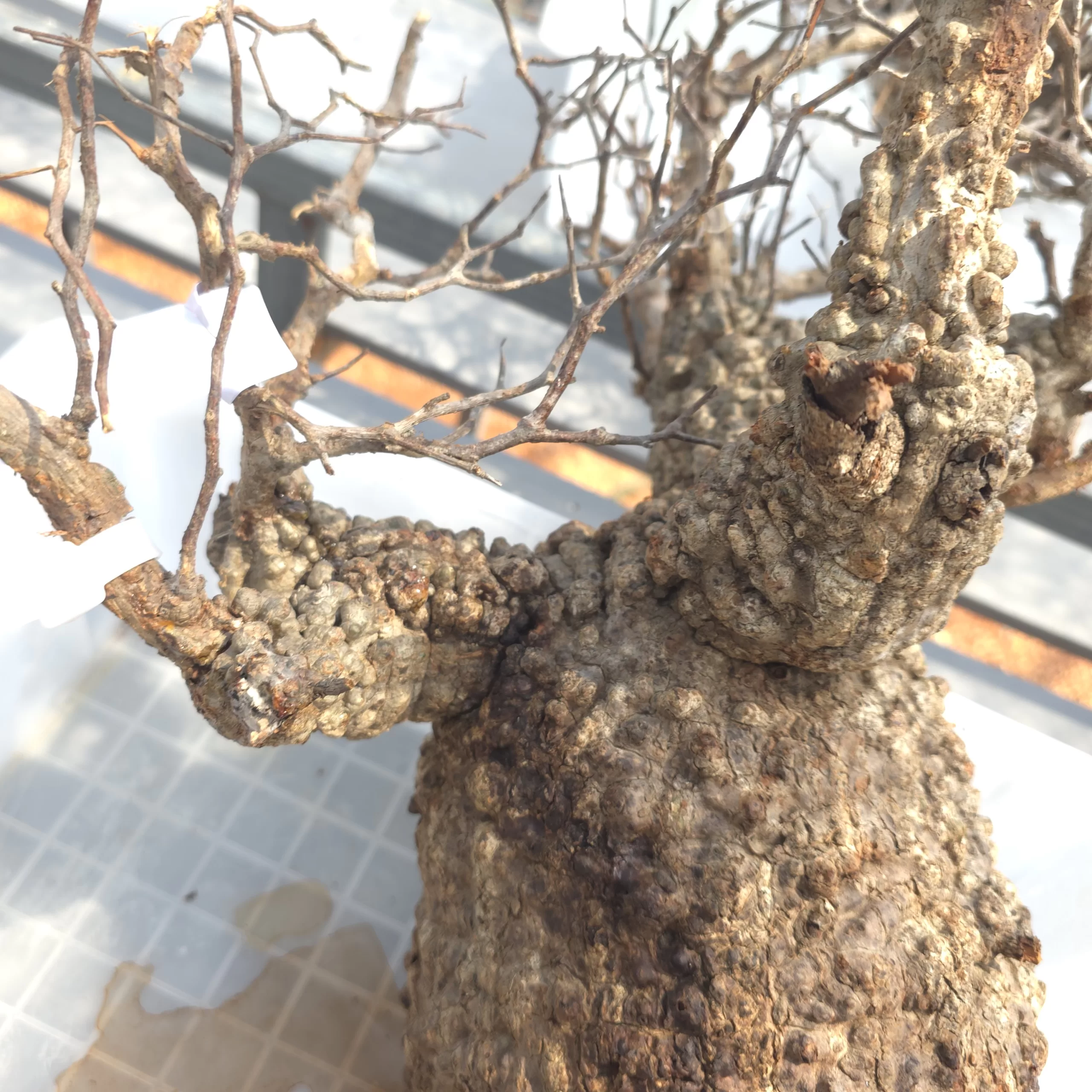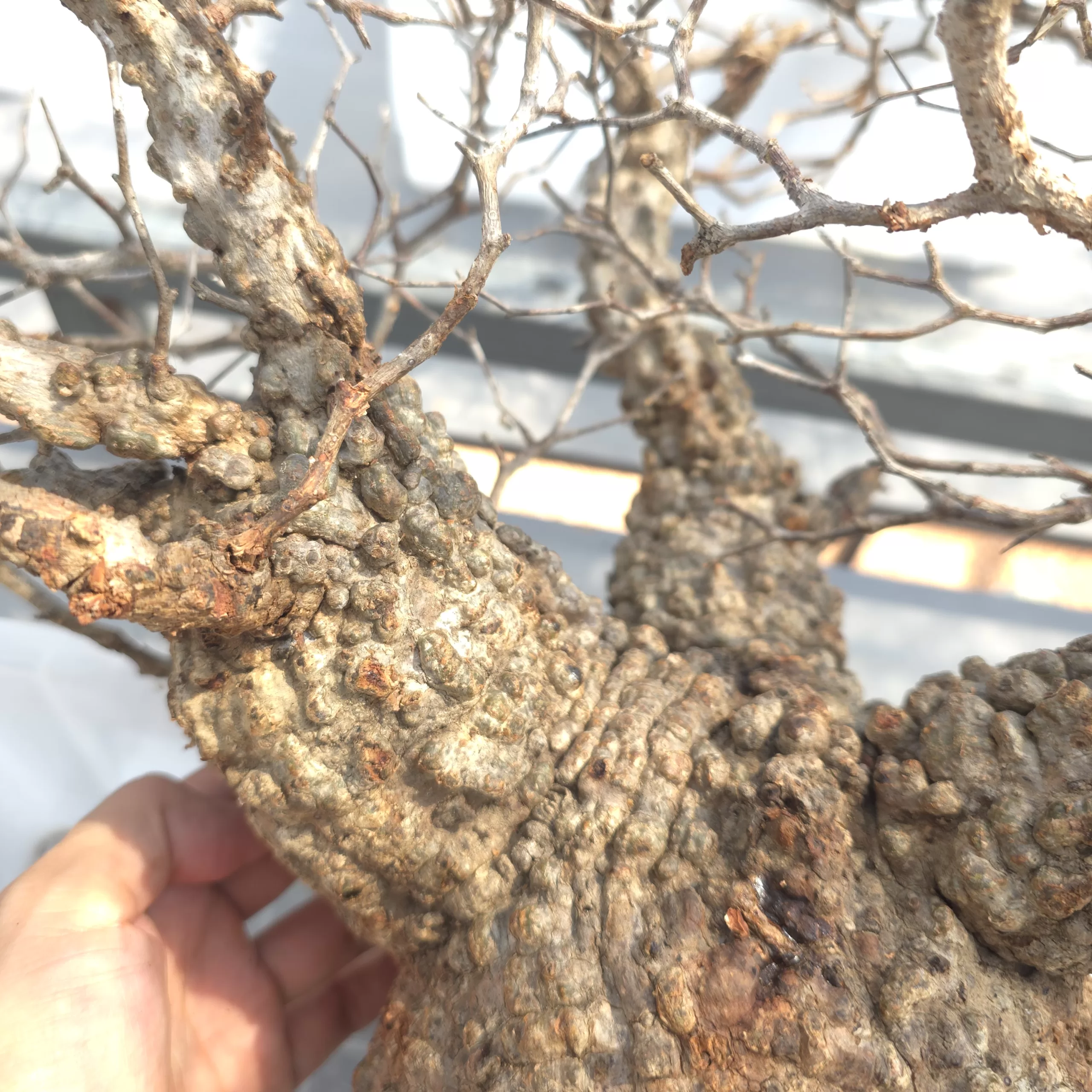 オペルクリカリア・パキプスは、マダガスカル原産の非常に希少な塊根植物で「塊根植物の王様」とも呼ばれています。ウルシ科オペルクリカリア属(Anacardiaceae Operculicarya )に属し、複雑に隆起したコルク状の幹からジグザグに枝を伸ばし、小さな丸い葉を茂らせます。幹の表皮はデコボコしてシルバーの色味を帯びており、独特な風貌と存在感が魅力です。成長は非常に遅く、小さなサイズでも樹齢は50年から150年に達し巨大な株は300年~500年ともいわれていますが、枝は毎年旺盛に伸び、剪定して長く楽しめます。寒さに弱く、冬は室内で育てる必要がありますが、夏は屋外で育てられます。冬には紅葉し、落葉する前に美しい赤い葉を楽しめます。