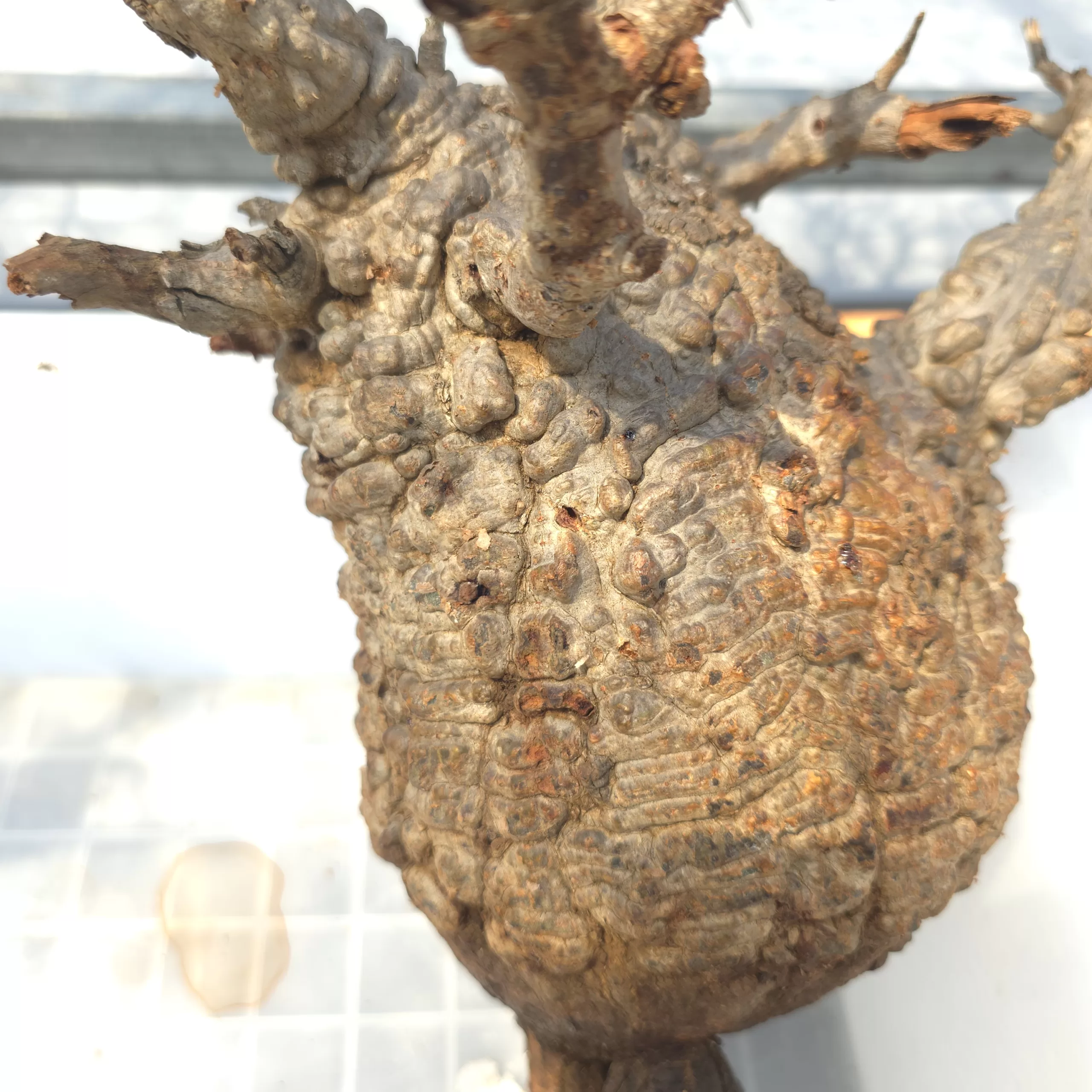 オペルクリカリア・パキプスは、マダガスカル原産の非常に希少な塊根植物で「塊根植物の王様」とも呼ばれています。ウルシ科オペルクリカリア属(Anacardiaceae Operculicarya )に属し、複雑に隆起したコルク状の幹からジグザグに枝を伸ばし、小さな丸い葉を茂らせます。幹の表皮はデコボコしてシルバーの色味を帯びており、独特な風貌と存在感が魅力です。成長は非常に遅く、小さなサイズでも樹齢は50年から150年に達し巨大な株は300年~500年ともいわれていますが、枝は毎年旺盛に伸び、剪定して長く楽しめます。寒さに弱く、冬は室内で育てる必要がありますが、夏は屋外で育てられます。冬には紅葉し、落葉する前に美しい赤い葉を楽しめます。